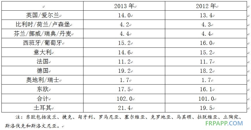 繼2012年歐洲GRP產(chǎn)量同比略降之后,2013年略微上升。估計歐洲總產(chǎn)量增長了1%,達102萬噸。歐洲的GRP行業(yè)以中小型公司為主流,因此不僅在制造工藝和自動化水平方面,而且在地區(qū)環(huán)境、各國條件和所用原料方面都很不相同。