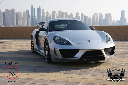 改裝的主角是保時捷Cayman,可以很清晰地看到加入了車身寬體套件,這些套件多半都采用了碳纖維材質(zhì),進氣口進行了加大處理,同時還有一個巨大的尾翼,一個四排氣裝置,全新的尾部擴散器,同時車身顏色也有所改變。