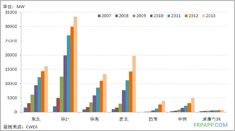 圖2: 2007-2013年中國(guó)各區(qū)域累計(jì)風(fēng)電裝機(jī)容量