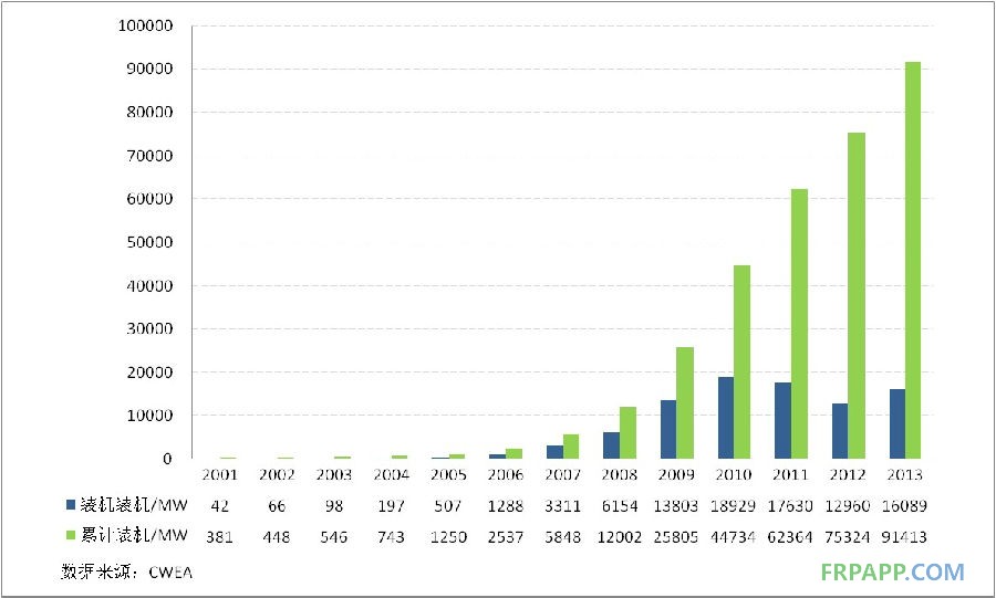 圖1: 2001-2013年中國(guó)新增及累計(jì)風(fēng)電裝機(jī)容量