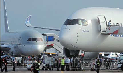 | 2月在新加坡舉辦的亞洲最大航展。波音787(后)與空客A350XWB(前)成為了關注的焦點 攝影:Landov/Aflo |