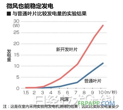 尤尼克斯還在葉片形狀上下了一番功夫。與曾經(jīng)合作開發(fā)出空氣阻力低、易揮動(dòng)球拍的日本長岡技術(shù)大學(xué)合作,設(shè)計(jì)出了適合發(fā)電的形狀。普通葉片的截面形狀像機(jī)翼。而新開發(fā)的葉片是細(xì)長的水滴形狀。采用這種形狀,可將阻礙葉片轉(zhuǎn)動(dòng)的阻力降至最小,不管風(fēng)從哪個(gè)角度吹來,都可獲得穩(wěn)定的推動(dòng)力。在相當(dāng)于城區(qū)較強(qiáng)風(fēng)的風(fēng)速5m下進(jìn)行實(shí)驗(yàn)證明,發(fā)電量是普通葉片的5倍。