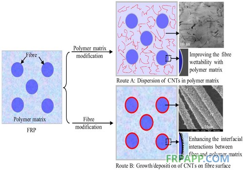 中國(guó)科學(xué)院新疆理化技術(shù)研究所環(huán)境科學(xué)與技術(shù)研究室高分子復(fù)合材料團(tuán)隊(duì)分析了碳納米管/高分子納米復(fù)合材料用于風(fēng)機(jī)葉片材料的可行性和獨(dú)特優(yōu)勢(shì)。碳納米管(CNTs)是一種管狀一維納米材料,具有優(yōu)異的力學(xué)、電學(xué)、熱學(xué)等性能。通過在高分子基體中添加少量的CNTs(一般<1.0 wt%),就可使材料的性能得到非常顯著的改善。例如在典型的葉片用環(huán)氧樹脂中添加0.5wt%CNTs,材料的導(dǎo)熱率可以提高80%以上。碳納米管/高分子納米復(fù)合材料還具有獨(dú)特的多功能性質(zhì):如納米填料的引入可以同時(shí)改善復(fù)合材料的模量、強(qiáng)度、韌性、耐疲勞等力學(xué)性能,而這種增強(qiáng)效果在傳統(tǒng)的高分子復(fù)合材料中幾乎難以實(shí)現(xiàn)。通過在風(fēng)機(jī)葉片材料-纖維增強(qiáng)復(fù)合材料(FRP)的組分(纖維或基體)中引入碳納米材料(如圖),可以提高基體的性能以及纖維和FRP基體之間的界面作用,進(jìn)而為改善風(fēng)機(jī)葉片的整體性能提供了可能。