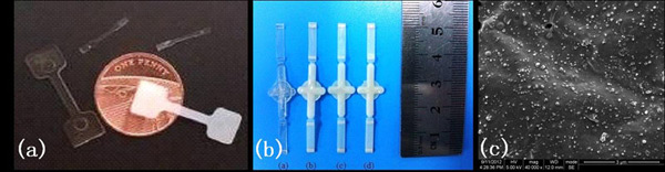 圖 聚乙烯醇/羥基磷灰石納米復合材料微型注塑加工制件(a, b)及脆斷面形貌掃描電鏡照片(c)