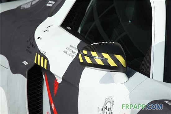 盡管這是一臺改款前的2009年款R8,但mbDESIGN仍然為其裝配了碳纖維材料的前分離器、側裙以及源自于V10版本的側葉。車尾帶有原廠R8 GT的碳纖維材料尾板,定制款碳纖維材料后備箱蓋,其它亮點還包括奧迪原廠的碳纖維材料側后視鏡蓋,SuperCar24的碳纖維材料擴散器等。