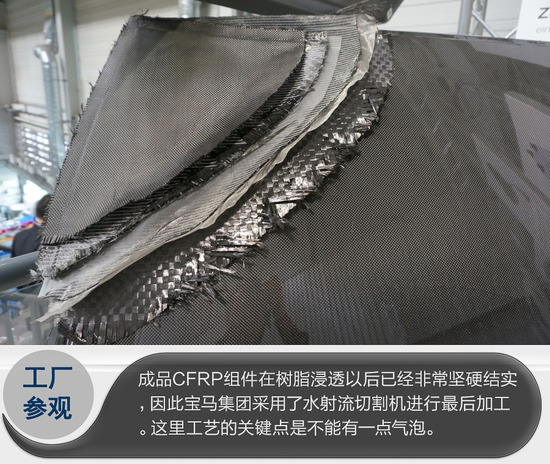最后參觀的重中之重的碳纖維強化塑料(CFRP)車間擁有大約200名員工,從事材料、工藝開發以及高科技超輕碳纖維強化塑料材料的制造。在過去的十年中,寶馬蘭茨胡特工廠已在碳纖維強化塑料材料專有的生產工藝、有效加工及優化生產周期方面取得豐富的經驗。