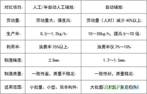 人工、半自動人工鋪放與自動鋪放對比(資料圖)
