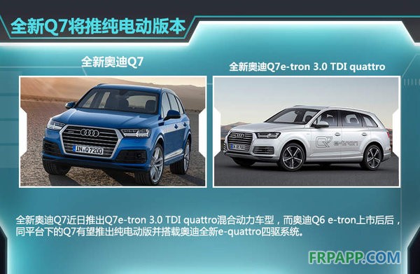 奧迪Q6e-tron基于Q7平臺(tái)研發(fā)制造,Q7推出純電動(dòng)版本也在情理之中。日前閉幕的日內(nèi)瓦車展奧迪發(fā)布了Q7e-tron 3.0 TDI quattro的混合動(dòng)力車型,由一臺(tái)3.0T柴油發(fā)動(dòng)機(jī)配合電動(dòng)機(jī)驅(qū)動(dòng),最大功率可達(dá)275kW、峰值扭矩為700Nm。而純電動(dòng)版的Q7有望采用R8 e-tron的動(dòng)力系統(tǒng)并搭載e-quattro電動(dòng)四驅(qū)系統(tǒng)。