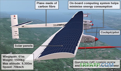 來自瑞士的兩位飛行員貝特朗-皮卡爾、安德烈-波許博格,正在駕駛著一架完全由太陽能驅(qū)動(dòng)的飛機(jī)“陽光動(dòng)力2號(hào)”進(jìn)行著環(huán)球旅行。整個(gè)旅程溫差極大,從-41攝氏度~50攝氏度,飛行高度也有9000米,超越珠穆朗瑪峰。