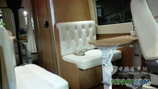 車(chē)內(nèi)布局從車(chē)頭至車(chē)尾分別為駕駛區(qū),商務(wù)休閑區(qū),生活區(qū)三個(gè)部分。駕駛區(qū)配備了水轉(zhuǎn)印桃木裝飾板儀表臺(tái)、桃木方向盤(pán)、真皮包覆裝飾以及360度旋轉(zhuǎn)座椅。商務(wù)休閑區(qū)配備了雙人豪華商務(wù)座椅(可平放)、可拆卸活動(dòng)桌、實(shí)木地板裝飾、吧臺(tái)酒柜、布藝窗簾(奔馳專(zhuān)用)、17寸吸頂式顯示器、數(shù)字電視等。生活區(qū)則配備電磁爐、電熱水壺、電冰箱、車(chē)載微波爐,玻璃鋼整體式衛(wèi)生間,吊柜儲(chǔ)物柜組合,廚房間吧臺(tái)總成(含亞克力臺(tái)面及杯架裝飾等)、12寸吸頂式DVD播放一體機(jī)(安裝于臥室)等旅居生活裝備。豐富的商務(wù)及休閑配置讓車(chē)主在工作與放松休閑之間自由切換。