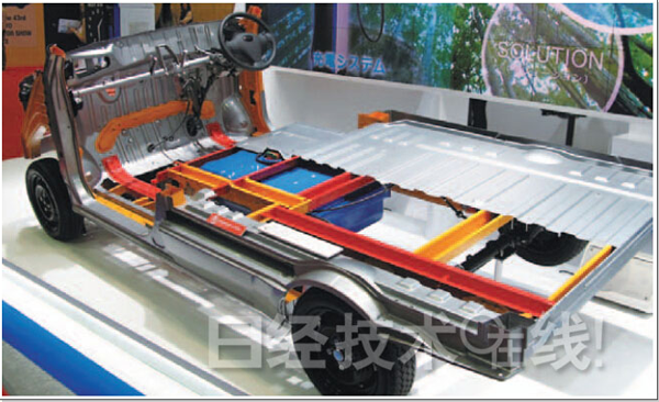 EV的部件數量比發動機車和HEV少,車體構造可以比較簡單(圖3)。因為骨架構件等的截面不需要復雜的成型,所以可以積極使用成型性欠佳的超高張力鋼板,在提高強度的同時,實現車體的輕量化。既然電池的重量大,車體就要徹底實現輕量化。