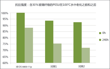 圖4. 含30 % 玻璃纖維的black PESU, 在100℃水中老化之前和之后的抗拉強度。
