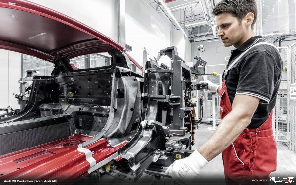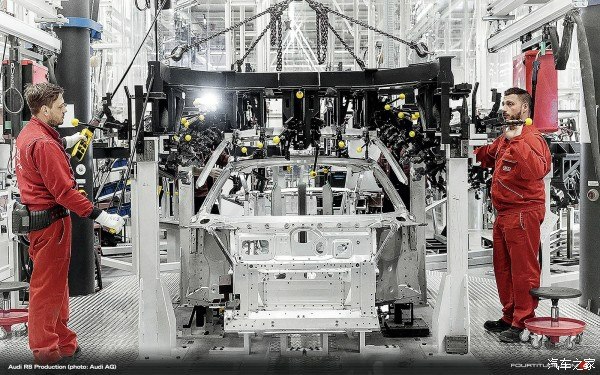 新 R8 是在德國的 Neckarsulm 奧迪工廠進行生產的,車身殼體運用了多種材料來進行輕量化。2014 年,奧迪對車身進行了小批量的生產來驗證輕量化研究。