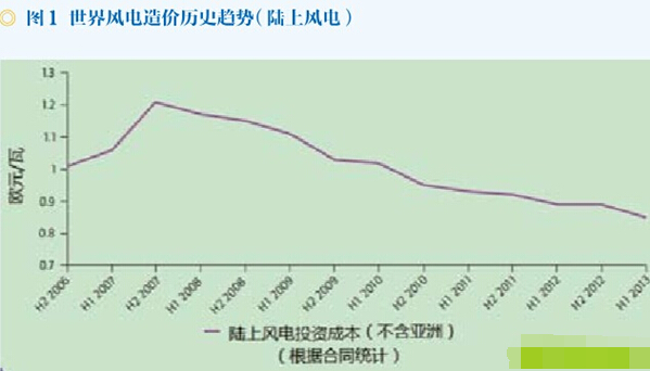 風(fēng)電成本逐漸下降。從投資成本(包括風(fēng)機、并網(wǎng)、基建、其他設(shè)施以及安裝等等)來看,2009年全球風(fēng)電投資成本為每千瓦1450~2600美元。隨著原材料(鋼鐵、銅)成本逐漸下降、供需情況出現(xiàn)逆轉(zhuǎn)以及制造商競爭激烈等因素影響,目前全球風(fēng)電成本有所下降而且范圍更加寬泛,達(dá)到每千瓦1100(中國)~2600美元(日本),其中美國與西歐分別為每千瓦1600美元以及1700美元。相比2008年,2013年,全球(不含亞洲)風(fēng)電投資成本已經(jīng)下降近1/3,具體如圖1所示。