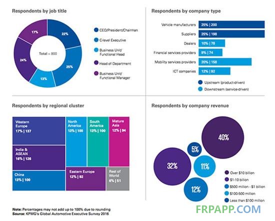 在這次的報告中,KPMG采訪了800位來自世界38個國家的汽車行業領先公司,包括車企、供應商、經銷商、金融服務供應商、汽車租賃公司、移動服務供應商以及首次加入的信息通信技術公司的高管們,數量是2015年的4倍。而且其中大約50%為C-level執行官或CEO、總裁。這些公司中72%的年收入都超過了10億美元,甚至其中的40%已經超過了100億美元。
