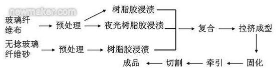 先將玻璃纖維布及無捻粗紗在120℃左右的溫度下,充分干燥,再用表面處理劑對其表面進行處理,干燥后,將表面處理的無捻粗紗用作復合材料的內層材料。將玻璃纖維布在夜光樹脂膠中充分浸漬,干燥后,用作復合材料的發光層材料。將玻璃纖維布在樹脂膠中充分浸漬,干燥后,用作復合材料的表層材料。然后將內層、發光層、表層材料復合進入拉擠成型模具進行固化成型,經牽引、切割,即可得制品。其工藝流程如圖1所示。