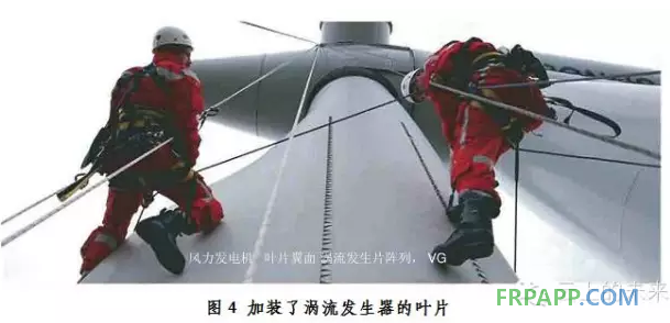 渦流發生器(VortexGenerator,簡稱VG)幾何形狀、布局位置及方式等因素對翼型氣動特性的都有影響,它布置在葉片的吸力面上,一般與前緣的距離約在15%到30%弦長處,它的用途主要是延緩在前緣附件的分離流動的產生,在某種程度上提升升力系數和增加阻力系數,所以采用渦流發生器需要根據翼型外形、攻角進行優化布置。圖4顯示的是已加裝了渦流發生器的葉片。