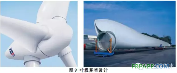 (2)對葉片根部的圓柱端進行修型處理。葉片內外圈翼型選型設計時,內圈即靠近葉根的部分內部區域主要是以結構特性設計為主,而在外圈靠近葉尖的區域則是以氣動特性為主的翼型設計方案。為了增加葉片做功能力的有效長度并且使得機艙頭部導流罩部位的空氣流動自然繞流,在根部也有采用適當的、鈍后緣的翼型的方法,如圖9。應當注意這樣的葉根設計方法雖然增加了葉片做功能力但是無疑增加葉片本身的尤其是葉片根部的載荷,所以對葉根連接螺栓等部位的強度校核是必不可少的。