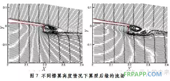 圖7所示為不同襟翼高度下(右圖比左圖的襟翼高度相對要高)的翼型后緣的流動情況,在襟翼前方一個渦,在其后方產生一個細長的尾流區,內有兩個反向渦。襟翼的存在增加了翼型的后緣的曲率,導致翼型吸力面后緣附件的流線向下彎曲,增大了翼型彎度,使得升力增大。由于襟翼的高度很小,位于邊界層之內,受粘性的影響,使得襟翼之后形成穩定的分離泡,該分離泡對翼型的尾流有一個壓縮的作用,尾流區變小,進而阻力減小。