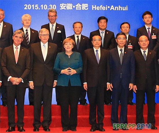 2015年10月30日,李克強(qiáng)總理、默克爾總理與參加中德經(jīng)濟(jì)顧委會(huì)座談會(huì)的兩國企業(yè)家合影留念,上排右三是康得集團(tuán)董事長鐘玉。