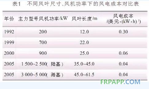 葉片是風力機的關鍵部件之一,涉及氣動、復合材料結構、工藝等領域。葉片的長度和風機的功率成正比,風機功率越大,葉片越長。對于500kW~ 2.5MW的風力機,葉片長13.5~ 39.0m(丹麥LMGlasfiber公司制造);660kW~1.65MW的風力機,葉 片長23~39m(丹麥VestasWindSystemsAS制造)。在兆瓦級風電機組中,如1MW的葉片長31m,每片重約4~5t;1.5MW主力機型風力機葉片長34~ 37m,每片重約6t;目前商業化風力發電所用的電機容量一般為1.5~2.0MW,與之配套的復合材料葉片長度大約32~ 40m,重6~ 8t;現代的54m大型葉片重l3t。現今世界上最大5MW的風力發電機的葉片長61.5m,單片葉片的質量接近18t,旋轉直徑可達126.3m。 葉片也是風機中成本最高的部件,雖然它的質量不到風機質量的15%。卻占風機成本的15%~ 20%。風葉類似于航空葉片,要求提高“提升比”(Lift-to-dragratio),并且其提升特性不易受葉片表面污染和粗糙度影響。從結構考慮要求葉片有較厚的葉型。葉片要經受20a應用,以經受風力造成的疲勞次數達108(也有以500萬次作標準)作標準。隨著風機功率的增加,風葉尺寸也相應增加。表1所示為不同年份風機功率、風葉尺寸和風電價格的變化趨勢。