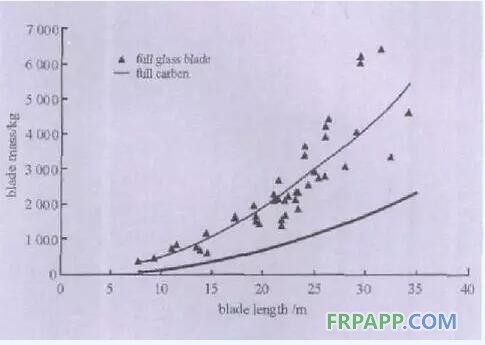 當葉片長度增加時,質量的增加要快于能量的提 取,因為質量的增加和風葉長度的立方成正比(圖1),而風機產生的電能和風葉長度的平方成正比。同時隨著葉片長度的增加,對增強材料的強度和剛度等性能提出了新的要求,玻璃纖維在大型復合材料葉片制造中逐漸顯現出性能方面的不足。為了保證在極端風載下葉尖不碰塔架,葉片必須具有足夠的剛度。減輕葉片的質量,又要滿足強度與剛度要求,有效的辦法是采用碳纖維增強。國外專家認為:“由于現有材料不能很好滿足大功率風力發電裝置的需求,玻璃纖維復合材料性能已經趨于極限,因此,在發展更大功率風力發電裝置和更長轉子葉片時,采用性能更好的碳纖維復合材料勢在必行。”他們認為當風力機超過3MW、葉片長度超過40m時,葉片制造時采用碳纖維已成為必要的選擇。事實上,當葉片超過一定尺寸后,碳纖維葉片反而比玻璃纖維葉片便宜,因為材料用量、勞動力、運輸和安裝成本等都下降了。
