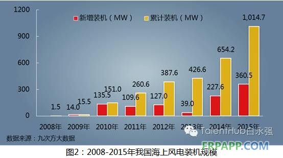我國海上風電從2007年第一臺金風(GW70/1500)試驗樣機在渤海灣裝機開始,至2010年東海大橋102兆瓦海上風電場(華銳SL3000/90)建成,我國海上風電逐漸走上爆發之路。2015年,我國海上風電新增裝機100臺,容量達到360.5MW,同比增長58.4%。其中,潮間帶裝機58臺,容量181.5MW,占海上風電新增裝機總量的50.35%;其余49.65%為近海項目,裝機42臺,容量179MW。