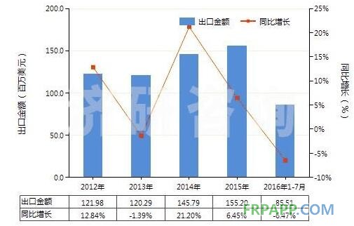 2016年1-7月我國(guó)短切玻璃纖維(長(zhǎng)度≤50mm)出口金額為85.51百萬(wàn)美元,與上年同期相比下降了6.47%。2015年我國(guó)短切玻璃纖維(長(zhǎng)度≤50mm)出口金額為155.20百萬(wàn)美元,與上年同期相比增長(zhǎng)了6.45%。詳見(jiàn)下圖: