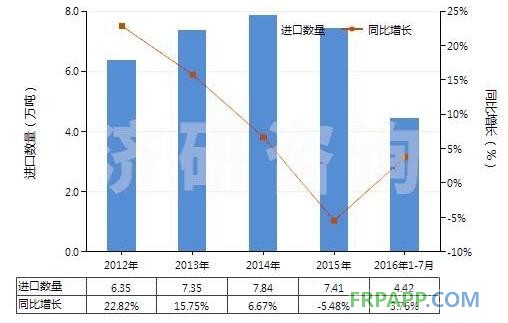 從進(jìn)口量方面來(lái)看,濟(jì)研咨詢數(shù)據(jù)顯示,2016年1-7月我國(guó)短切玻璃纖維(長(zhǎng)度≤50mm)進(jìn)口量達(dá)4.42萬(wàn)噸,與上年同期相比增長(zhǎng)了3.76%。2015年我國(guó)短切玻璃纖維(長(zhǎng)度≤50mm)進(jìn)口數(shù)量為7.41萬(wàn)噸,與上年同期相比下降了5.48%。