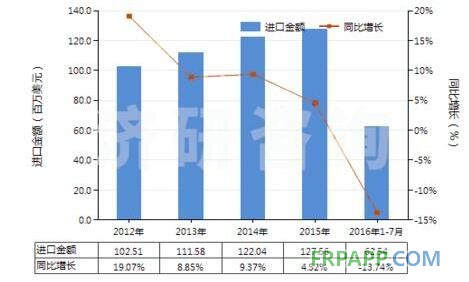 圖 2012-2016年7月中國(guó)短切玻璃纖維(長(zhǎng)度≤50mm)(HS70191100)進(jìn)口總額及增速統(tǒng)計(jì)