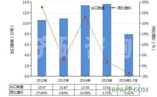圖 2012-2016年7月中國(guó)短切玻璃纖維(長(zhǎng)度≤50mm)(HS70191100)出口量及增速統(tǒng)計(jì)