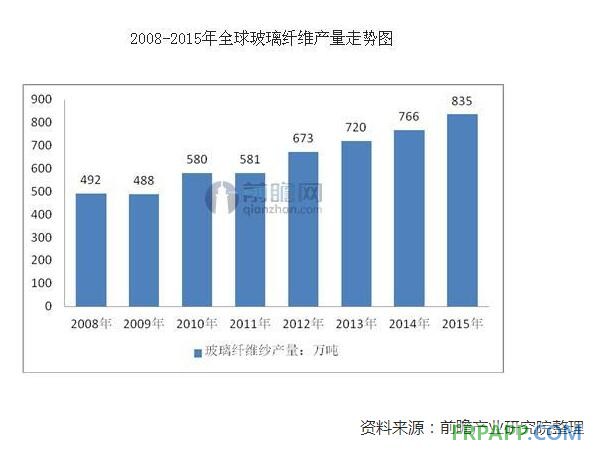 據前瞻產業研究院《中國玻璃纖維行業報告》的統計,近年來全球玻璃纖維產量逐年增加,去年已經達到835萬噸。