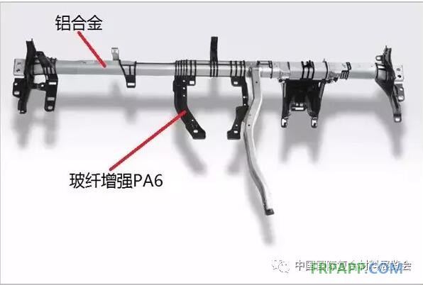 該技術已經在儀表板的支柱——管梁上實現實用化。由鋁合金和PA構成,利用共聚PA粘合劑粘合了兩種材料。戴姆勒在3款車型上采用。2013年德國戴姆勒在“梅賽德斯·奔馳A級”上首次采用,之后“梅賽德斯·奔馳B級”和“梅賽德斯·奔馳SLS級”也相繼配備。使用的PA為玻璃纖維強化PA6。重量最大減輕2成。