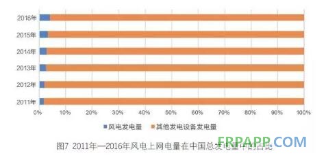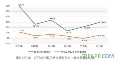 從圖6 可以看出,近6年來,風電上網電量的增幅一直遠遠高于全國總電量的增幅,表明前者在各類電源發電量中的占比在不斷提升。2011年,風電占全國總發電量的1.7%,到2016年,這一比例上升為4%。