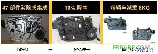 專業從事汽車零部件設計與制造的全球性公司阿文美馳制作了第一款高度集成的長玻纖PP塑料門板模塊,能夠滿足全球主機廠的性能要求,較之鋼材門板模組,減重1.65kg,減重達30%,同時集成了零部件數量,降低成本10%,可以使每輛車減重6kg。