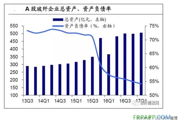 2016 年期末玻纖上市公司資產(chǎn)負債率約54.9%,同比降約6.1 個百分點,預(yù)計主要受益于盈利改善對凈資產(chǎn)的增厚;2017 年1 季度末資產(chǎn)負債率約54.2%,環(huán)比降約0.8 個百分點。