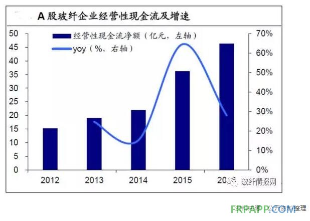 2016 年玻纖上市公司經(jīng)營性現(xiàn)金流約46 億元,同比增約28%;2017 年1 季度經(jīng)營性現(xiàn)金流約4 億元,同比減少約22%。