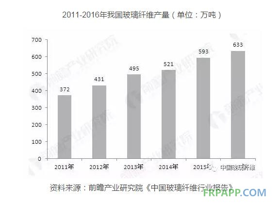 產量方面,數據顯示,全球玻纖產量從2008年的492萬噸增長至2016年的875萬噸,當中中國是推動全球玻璃纖維產量增長的主要動力。2016年中國玻璃纖維產量為633萬噸占全球玻纖產量的72.34%。