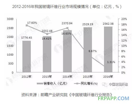 銷售收入方面,數據顯示,2016年我國玻璃纖維和玻璃纖維增強塑料制品制造行業銷售收入2562.38億元,同比增長1.31%。其中玻璃纖維行業1631.41億元,同比增長2.06%;玻璃纖維增強塑料930.97億元,同比增長0.03%。