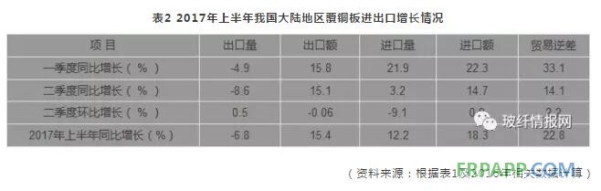 2、2017年上半年我國大陸地區覆銅板進出口增長情況