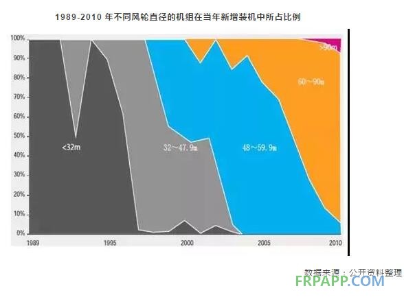 不同風輪直徑的機組,2000 年前后,以 32-47.9 米的為主導;2005 年前后,以 48-59.9 米的為主導,而 2010 年后,60-90米的成為了主導。