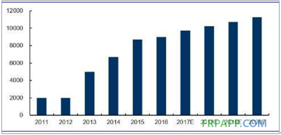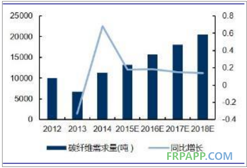 碳纖維在一般工業領域的應用十分廣泛,包括建筑物補強;沿海油氣田、深海油田的鉆井平臺以及壓力容器等等。由于碳纖維在一般工業領域下游比較分散,我們粗略假設碳纖維在一般工業領域的復合增長率為 5%,則到 2018 年一般工業領域對碳纖維需求將達到18500 噸(2014 年為 14500 噸)。