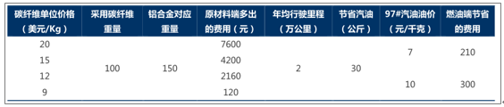 影響碳纖維在汽車上大規模應用的主要障礙還是成本過高。對碳纖維在汽車上應用的經濟性進行簡單測算(僅考慮原材料端的成本,不考慮加工、設備等費用):假設每輛汽車采用 100Kg 的碳纖維來代替鋁合金(150Kg),每輛汽車每年行駛里程 2 萬公里,按 7 元/kg(97#汽油)價格計算,如果碳纖維的價格能下降至 9 美元/kg(行業龍頭 Toray 的 T700級別碳纖維價格約 22 美元/Kg),其經濟性將與鋁合金不相上下。