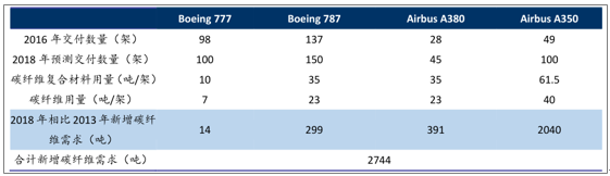 根據預測,2018 年僅波音 777 和 787、空客 A380 和 A350 這四種機型對碳纖維的需求將達到 9185 噸,相比 2016 年增加 2744 噸。因此,僅考慮民用飛機需求增長的部分,全球航空航天領域對碳纖維的需求將由 2013 年的 1.76 萬噸增長至 2018 年的 2.03 萬噸,年復合增長率為 7.40%。