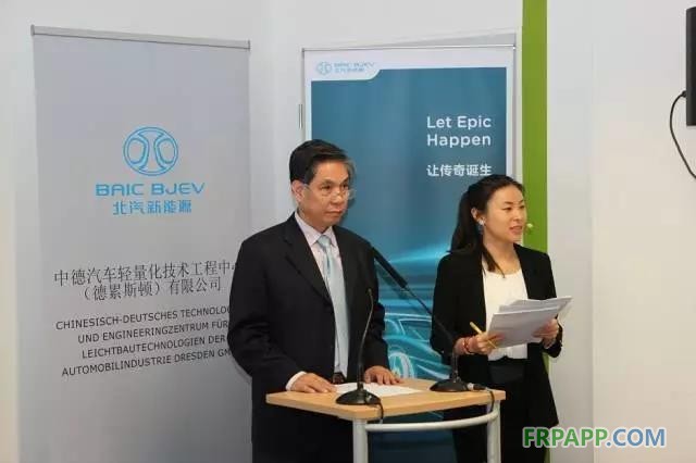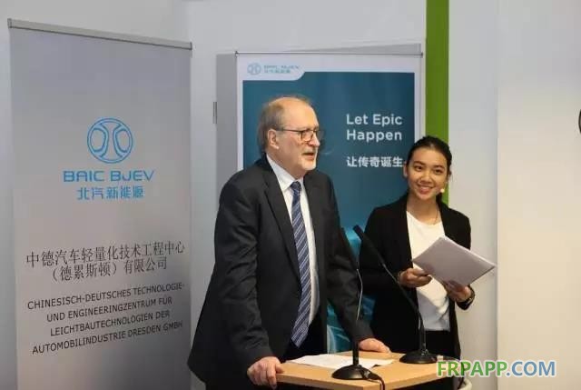 中國駐德國使館科技處公使銜參贊尹軍代表科技部部長萬鋼,薩克森州科技部國務秘書高爾,北汽新能源陳上華副總經理,德累斯頓工業大學校長穆勒-史泰因哈根教授以及享有“歐洲輕量化之父”聲譽的北汽新能源輕量化技術首席科學家胡芬巴赫分別在揭牌儀式上致辭。