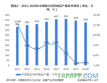 圖表2:2011-2018年中國復合材料制品產量及其增速(單位:萬噸,%)