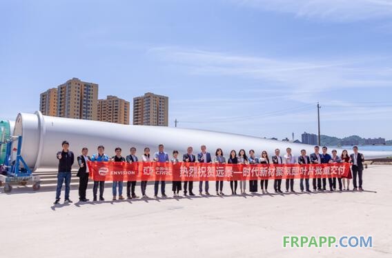 CPIC在風電紗上處于領先地位,產品得到國內外主流客戶的批量使用,是公司一直以來的拳頭產品。為了進一步強化在風電紗產品的優勢,CPIC從2009年開始布局在聚氨酯用紗的開發。十年磨一劍,CPIC研發中心和COVESTRO研發團隊一起攻關,對浸潤劑配方、低水分工藝、聚氨酯測試技術做了系統的研究,進行了上百次的試驗,終于開發出了聚氨酯風電葉片專用紗467W。繼2016年上玻院使用CPIC生產的聚氨酯織物在阜寧工廠39.5米灌注試驗生產了全球第一支全聚氨酯葉片, 2018年全球第一套主梁和腹板使用聚氨酯樹脂55.2m葉片在遼寧鐵嶺成功掛機之后, 2019年4月中旬又有重大進展,時代新材使用CPIC聚氨酯織物灌注新研制的2.2兆瓦世界最長新型高性能聚氨酯樹脂體系風機葉片在株洲光明工廠下線。這批葉片經過遠景現場驗收并實現了批量交付,終于從聚氨酯葉片試驗實現了商業化銷售。為了見證這一歷史時刻,遠景和時代新材邀請原材料廠家共同參與了此次見證會,CPIC質量總監羅成云應邀出席,并同遠景、時代新材和COVESTRO參與聚氨酯葉片項目的領導在時代新材光明工廠聚氨酯葉片前合影留念。