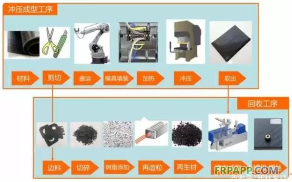 例如,日本帝人已能夠根據特殊需求,在工藝流程中設計添加回收工序,將沖壓后的熱塑性碳纖維復合材料邊角料切碎、注塑、制成再生材,用于制作成小型產品或者在碳纖維樣件上注塑螺母螺柱用。這種方法能較大程度地降低原材料損耗,提高熱塑性碳纖維復合材料的使用效率,降低綜合成本,從而實現了環保的目的。