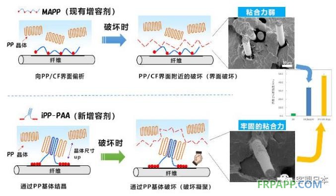 金澤工業(yè)大學(xué)與三榮興業(yè)的研究團(tuán)隊(duì)共同開發(fā)的iPP-PAA(等規(guī)聚丙烯聚丙烯酸共聚體)使用的增容劑是使碳纖維與樹脂通過面結(jié)合,少量使用就能提高界面粘合性,因此能實(shí)現(xiàn)不僅機(jī)械特性優(yōu)異(高比強(qiáng)度、高比彈性模量)、導(dǎo)電性(抗靜電)也非常出色的復(fù)合材料。此外,利用本次的發(fā)明,即使是碳纖維長度為0.1~50mm的短纖維也能確保剛性,因此還可以提高熱塑性碳纖維復(fù)合材料的注射成型和擠壓成型等成型性,有望在廣泛的領(lǐng)域擴(kuò)大用途。