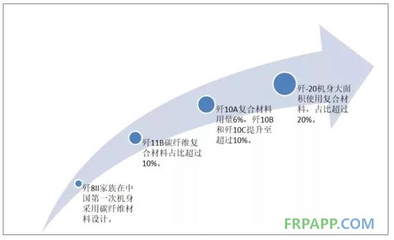 我國軍機的復材用量快速提升。伴隨著我國航空產業的進步,碳纖維復合材料在各型號軍機中的應用占比也持續提升。殲-8Ⅱ是我國首次在殲擊機機身中使用碳纖維復合材料、殲-11B、殲-10B、殲-10B用量都達到10%左右,而新一代隱身戰斗機殲-20更超過20%。